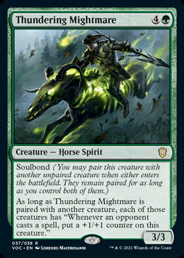 NM Magic! The Gathering Innistrad Crimson Vow Commander Thundering Mightmare collector number #037 Rare Green Creature with art by Lorenzo Mastroianni