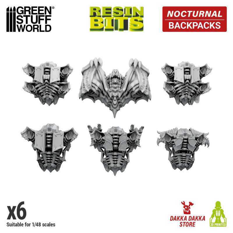 Nocturnal Backpacks from the Resin Bits range by Green Stuff World. A pack of 6 3D printed ABS-like resin Night Lord style backpacks to help you customise your Warhammer 40k space marines and other miniatures that you would like to modify for your tabletop, dioramas and hobby projects.
