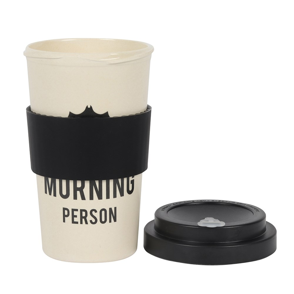 A fantastic eco friendly reusable travel mug in a cream colour with an upside down bat and the words 'Not a morning person' written in black, topped with a black lid. Made from bamboo fibre and complete with a silicone sleeve, and lid with a stopper helping you to warn people to approach with caution until at least noon.