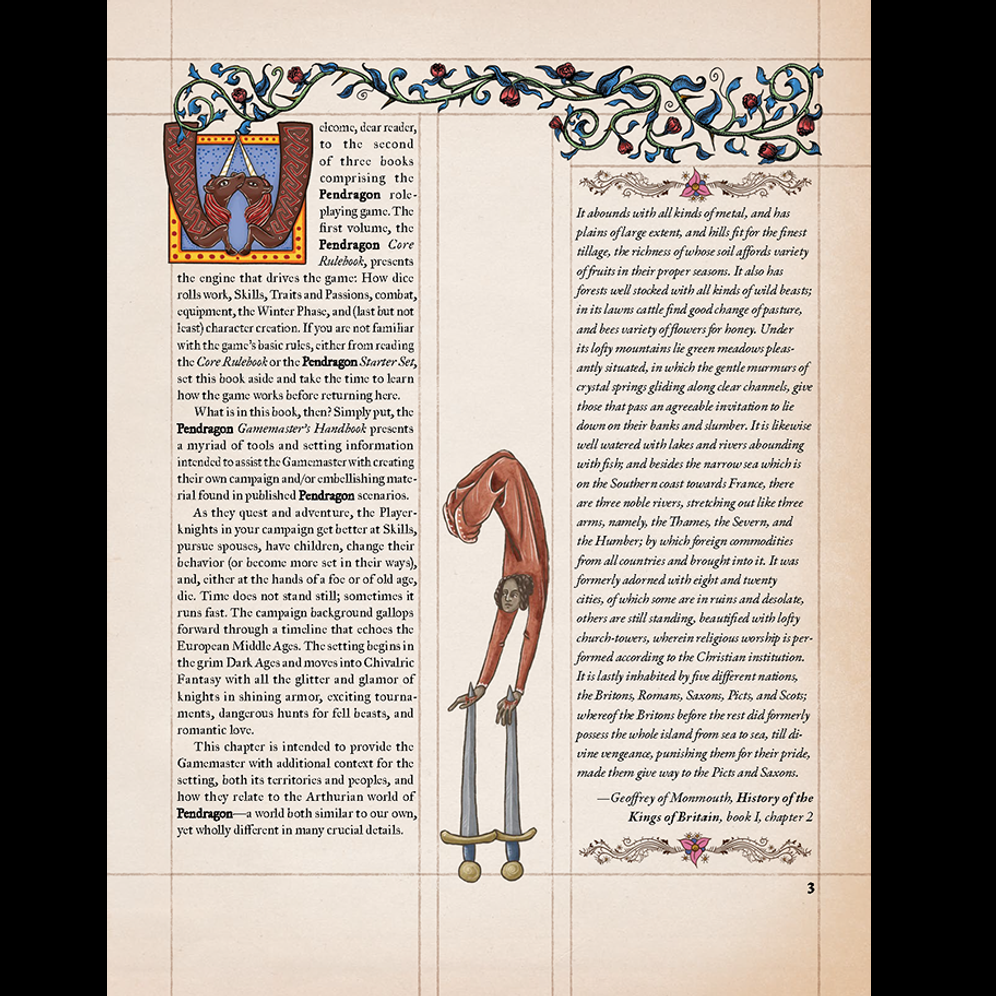 The Gamemaster’s Handbook greatly expands the setting of Pendragon, offering highlights of important characters and time periods, as well as courtly intrigue and a myriad of strange and wondrous beasts, spirits, fairies, and fiends that lurk in the dark corners of Arthur’s Britain. The book delves into in-depth discussions of religion and magic, providing guidance on how to effectively incorporate these elements into your game.