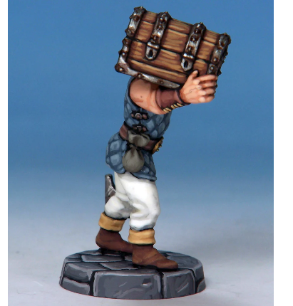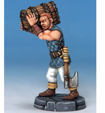 Expand your tabletop adventures with the Crooked Dice Porter. This 30mm white metal miniature represents a brawny porter, perfect for delivering cargo or carrying treasures out of the dungeon. The figure wears a quilted leather jerkin, is armed with a battle-axe, and carries a small chest over his shoulder.