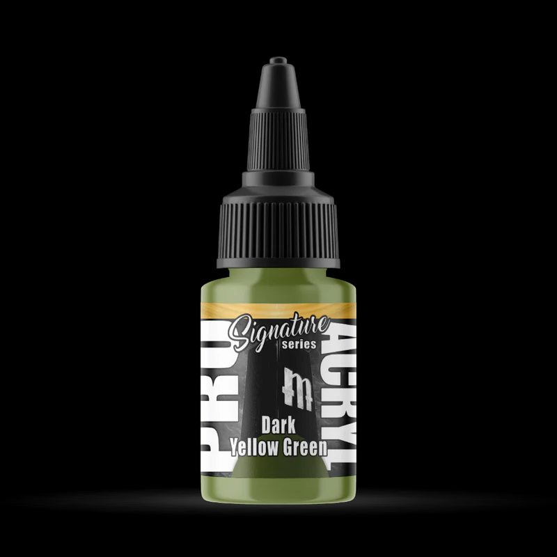 Enhance your miniatures with Vince Venturella Dark Yellow Green from the Pro Acryl Signature Series. This 22ml bottle of high-density pigmented acrylic paint is a favorite among painters for its rich color and superior coverage. Perfect for both brush and airbrush techniques, it ensures precision and a smooth application. The Pro Acryl no-clog cap provides the convenience of a dropper bottle and twist cap, giving a mess-free experience.