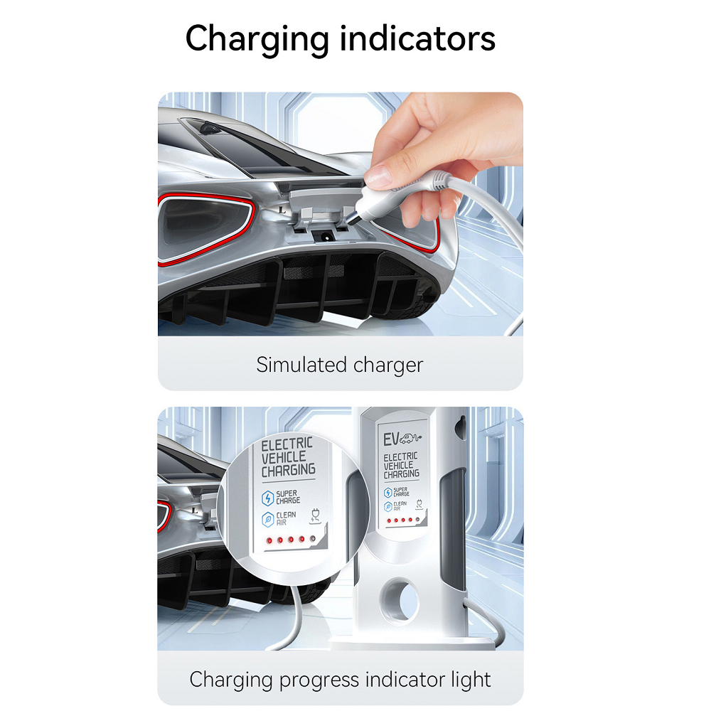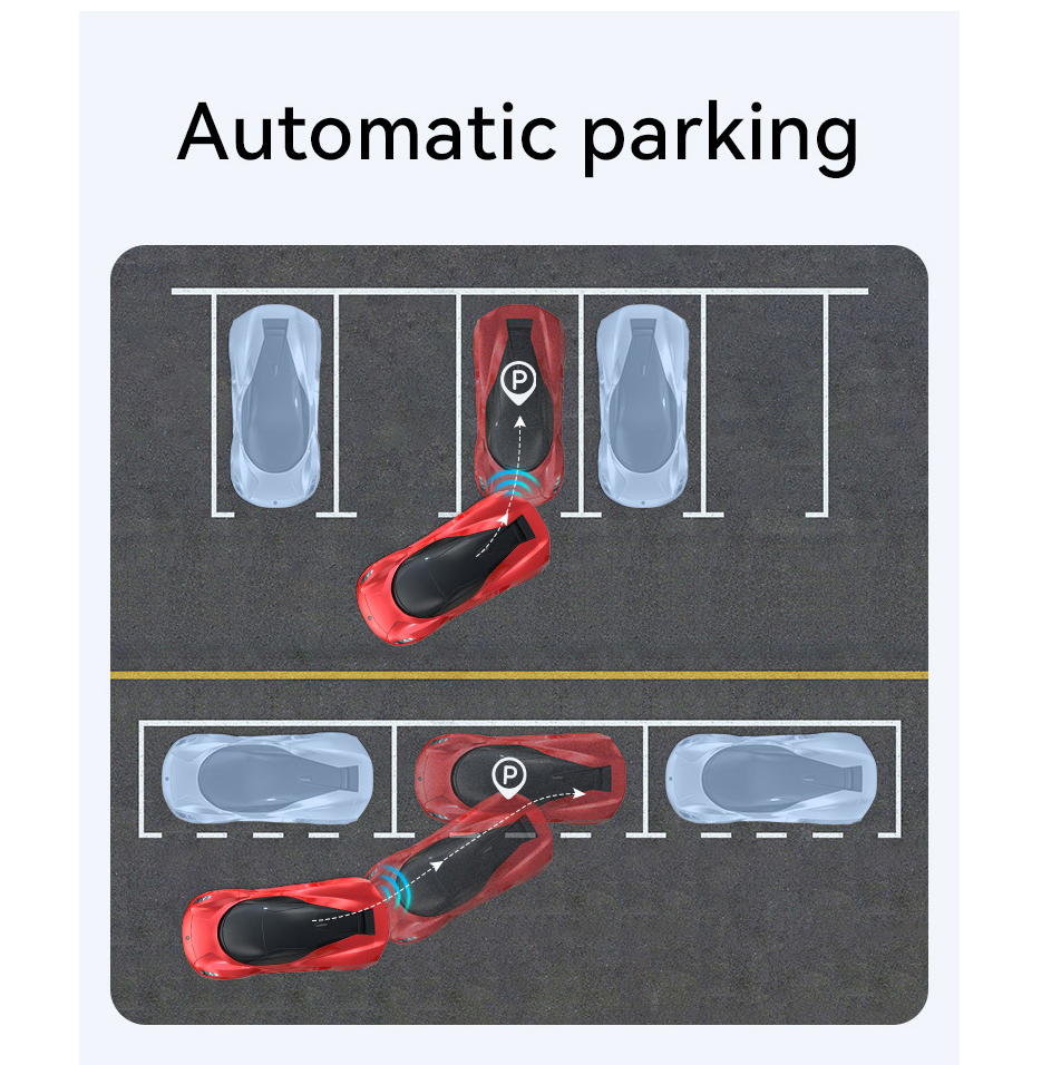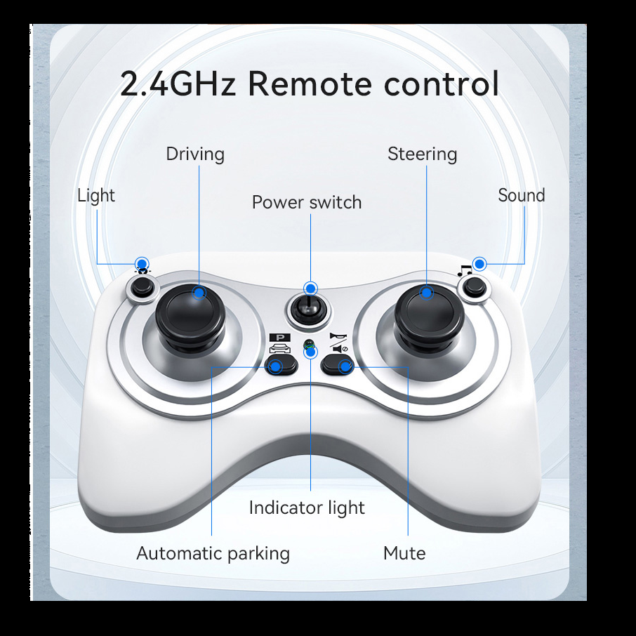The car includes a scale "fast charge" charging station, working taillights, and automatic parking functionality. Its ABS plastic body ensures durability, while the included 2.4GHz remote control provides seamless operation. The set includes a 3.7V/1,200mAh li-ion rechargeable battery and USB charger, though two AA batteries are required for the remote (not included).