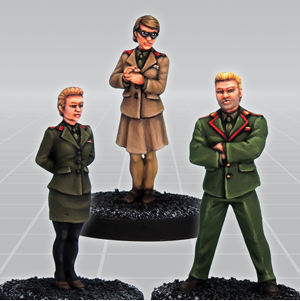 Red Stars by Crooked Dice a set of three 28mm scale miniatures for your tabletop games representing two females and a male gaming figure wearing uniforms.