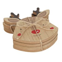 A fun and cute set of four coasters in the shape of reindeer faces with a red nose for your festive table and home decoration.