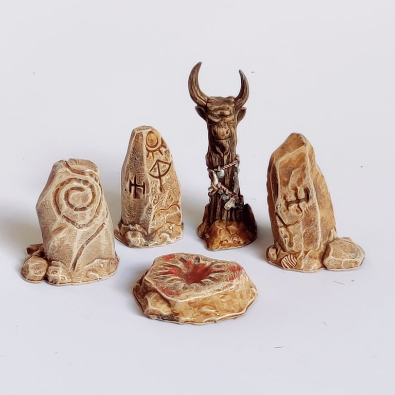 A Sacrificial Stones set by Iron Gate Scenery printed in resin for 28mm scale, this pack includes three sacrificial stones, one sacrificial stone and one sacrificial totem making a great edition to your town setting, RPGs, tabletop games, dioramas, scenery and more hobby needs