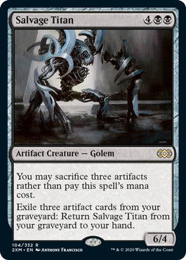 Card Text: You may sacrifice three artifacts rather than pay this spell's mana cost. Exile three artifact cards from your graveyard: Return Salvage Titan from your graveyard to your hand.