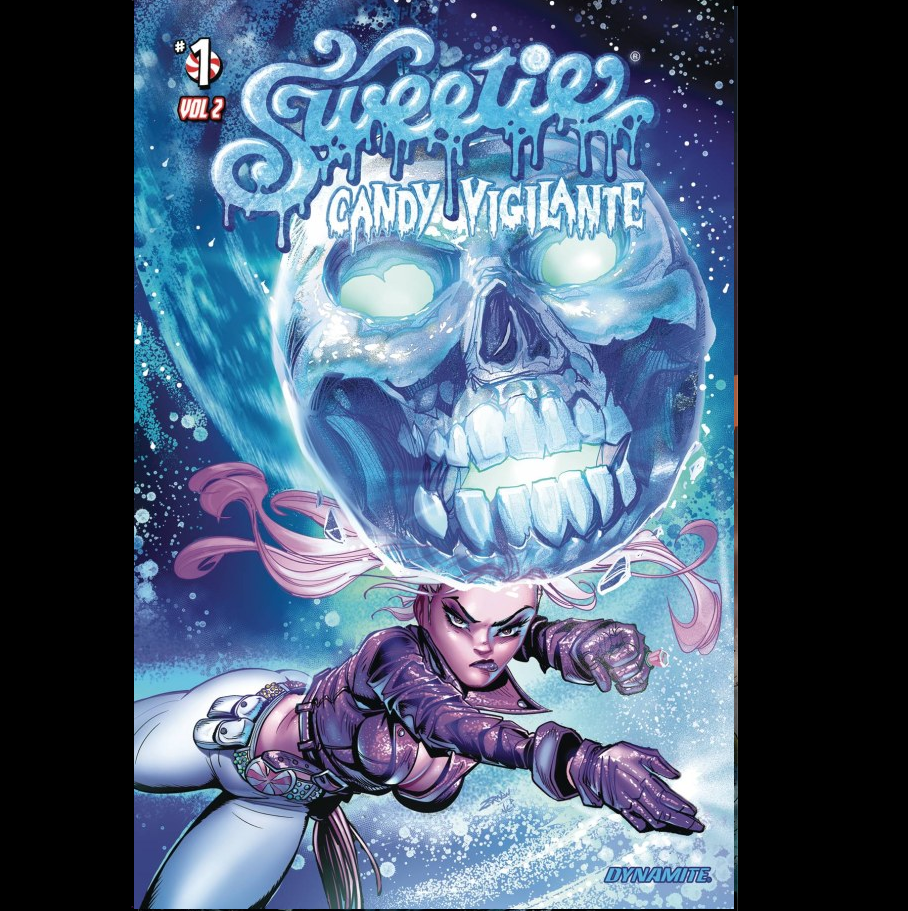 Sweetie Candy Vigilante #1 from Dynamite Comics. Sweetie and her Candy Vigilante squad are back to kick off issue #1, Vol 2 of the SWEET new series with an epic "Sugartown Showdown" not to be missed! Together with her shape shifting, licorice-loving lycanthrope, Candy Wolf, and newly 'minted' ninjette warrior, Pixie Stix, Sweetie faces off with 'salty' arch nemesis Bart Volgare and his gang of thugs in the icy, snowy streets of New York City with a violently delicious fury.