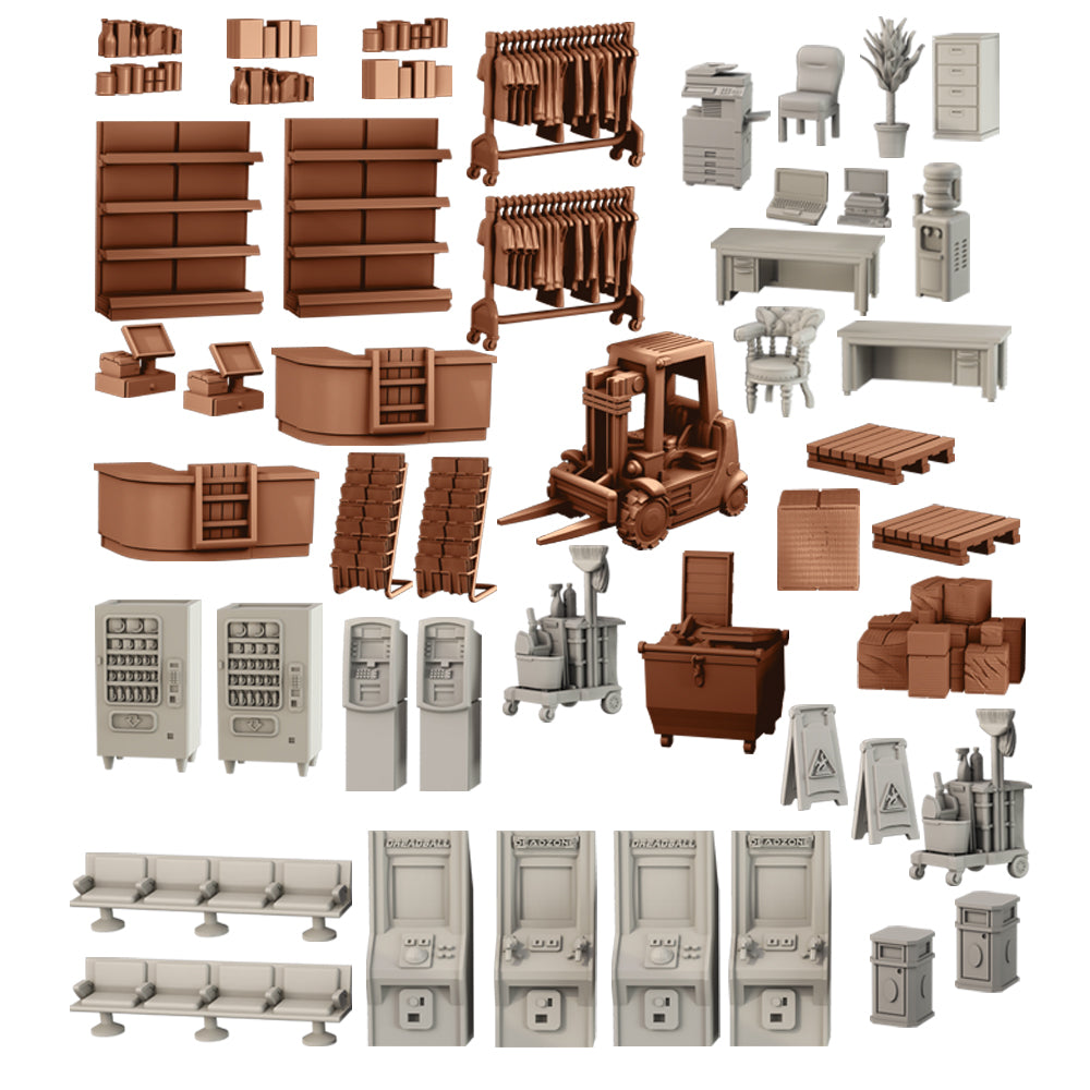 The sprawling urban areas of cities play host to many stories and conflicts. From deserted post-apocalyptic ruins to contemporary criminal skirmishes in, this set you’ll find the furnishings for offices, warehouses, shops, and malls. A huge variety of pieces to fill any built-up area!