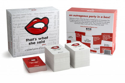 Welcome to that's what she said game, the party game of twisted innuendos! This outrageous party in a box has players matching hilarious red setup cards to the funniest white phrase cards.