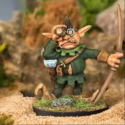 The Range by Northumbrian Tin Solider holds a bow in one hand and a spyglass to his eye with the other hand, with large ears and large floppy front shoes looking great on your fantasy gaming table.