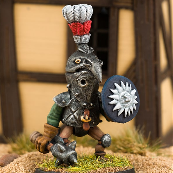 The Raven by Northumbrian Tin Solider a metal miniature for your gaming table holding a mace in one hand, a round shield in the other, a beaked shaped helmet and large feather adornment.