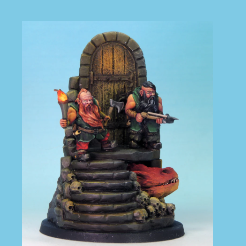 There Be Dragons by Crooked Dice, a resin miniature diorama for your tabletop games representing two male figures, only holding a torch and an axe, the other holding a crossbow ready stood at the top of steps with a door behind them. Underneath the steps a dragon pokes out its head, surrounded by skulls, waiting for these two new tasty morsels to venture further down