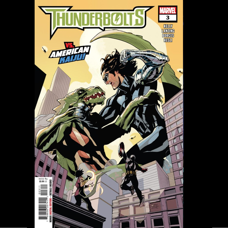 Thunderbolts #3 from Marvel Comics by Jackson Lanzing and Collin Kelly with art by Geraldo Borges. When an attempt to recruit U.S. Agent and his partner, Todd Ziller, to the fight against Red Skull goes terribly wrong, it will take everything in Shang-Chi's and Bucky Barnes' arsenals—and more than a little luck—to keep the American Kaiju from destroying Hong Kong