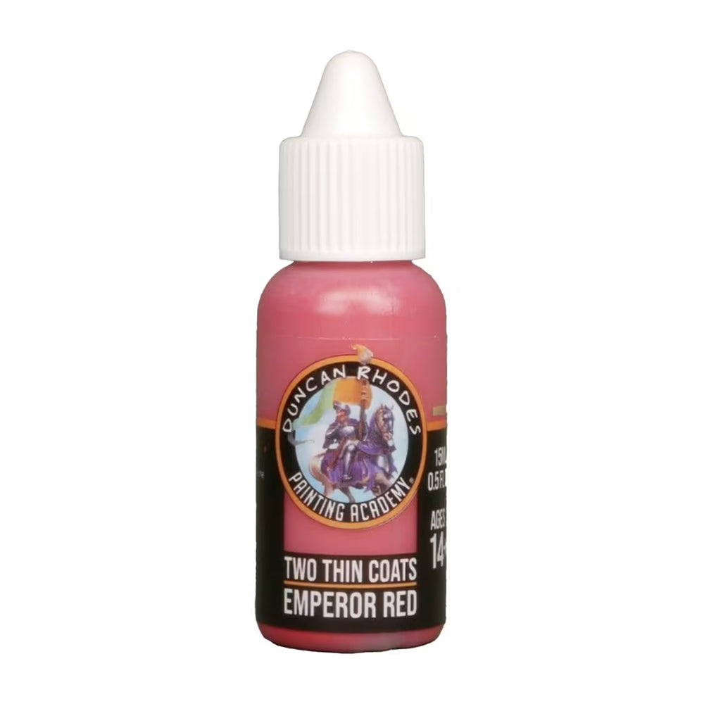 Duncan Rhodes Painting Academy Two Thin Coats is hobby paint that comes in a variety of colours in shadow, midtone, highlights, washes, varnishes and glazes. According to DRPA this Two Thin Coats formulation is colour matched with Citadel Wazdakka Red paint
