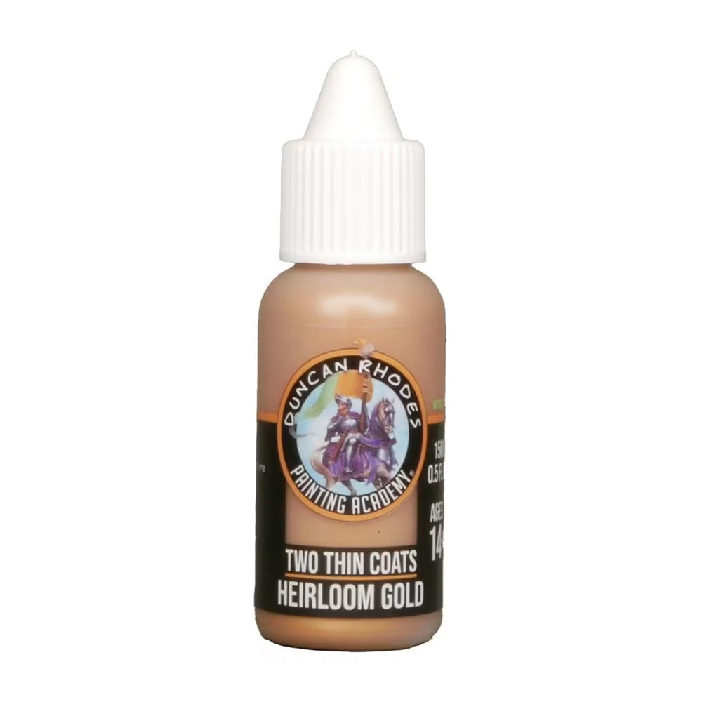 Duncan Rhodes Painting Academy Two Thin Coats is hobby paint that comes in a variety of colours in shadow, midtone, highlights, washes, varnishes and glazes. According to DRPA this Two Thin Coats formulation is colour matched with Citadel Skullcrusher Brass paint