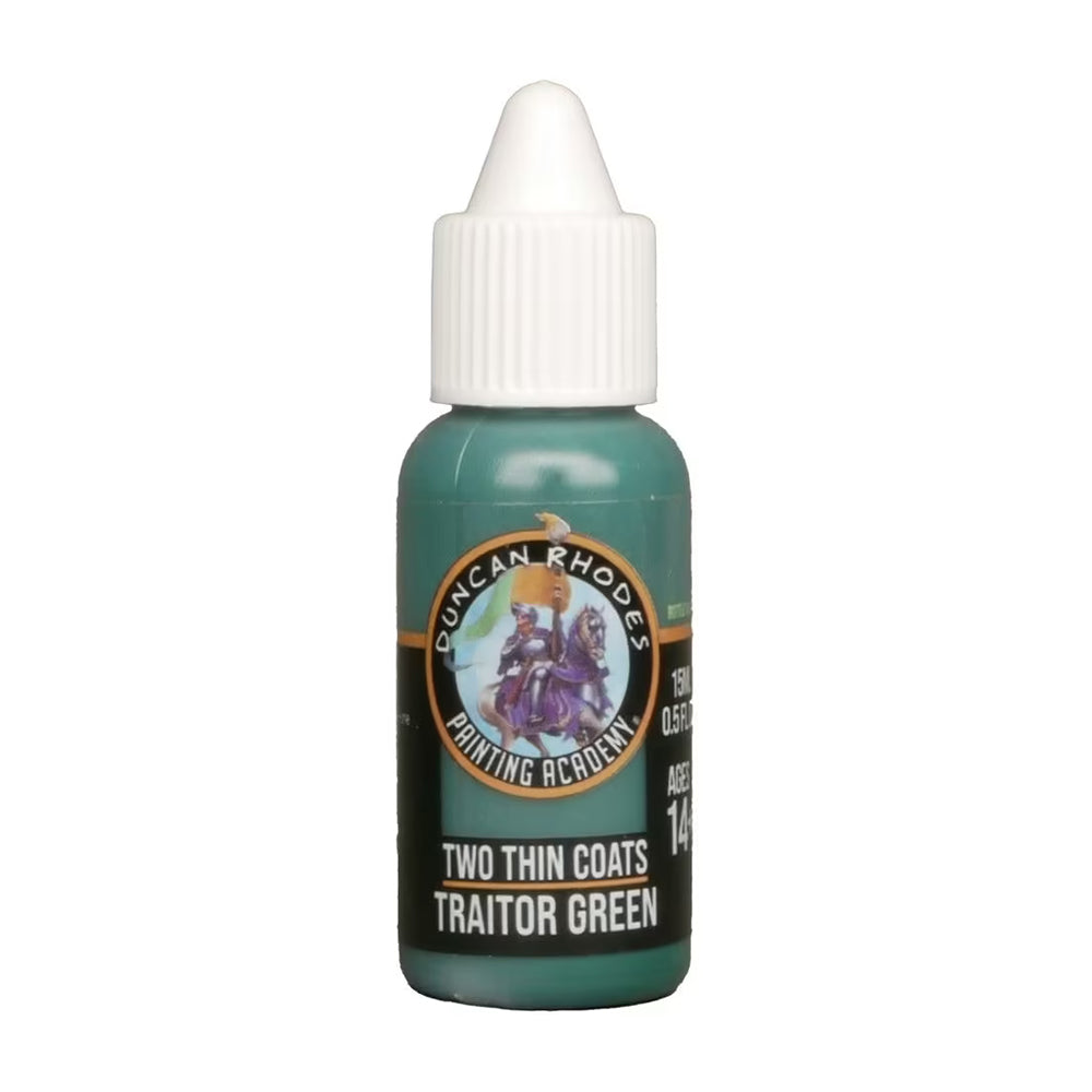 Duncan Rhodes Painting Academy Two Thin Coats is hobby paint that comes in a variety of colours in shadow, midtone, highlights, washes, varnishes and glazes. According to DRPA this Two Thin Coats formulation is colour matched with Citadel Sons of Horus Green paint