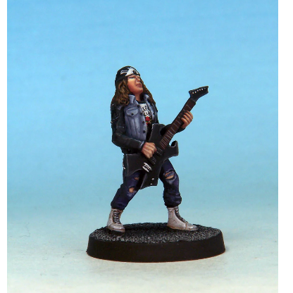 Sculpted by Stavros Zoutalis, Van Hellion is cast in durable white metal as a single-piece miniature requiring no assembly. He is sculpted mid-performance, shredding on his guitar with long flowing hair and a bandana completing his anarchic look. This distinctive design makes him an excellent addition to fantasy RPGs, post-apocalyptic skirmish games, or as a display project for painters who want a model full of attitude and energy.