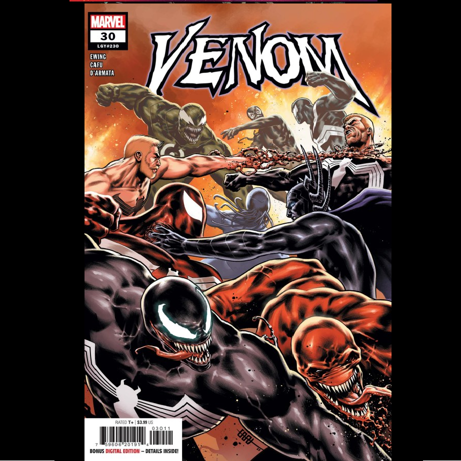 Venom #30 from Marvel Comics written by Al Ewing with art by Cafu. Eddie Brock has spread himself too thin—literally! Fractured, exhausted and losing focus, Eddie risks slipping into a familiar sort of look, along with some old (and lethal) habits! Face-to-face against manifestations of his own anger, hate and wrath, will Eddie have the strength to face his greatest foes yet and emerge victorious?