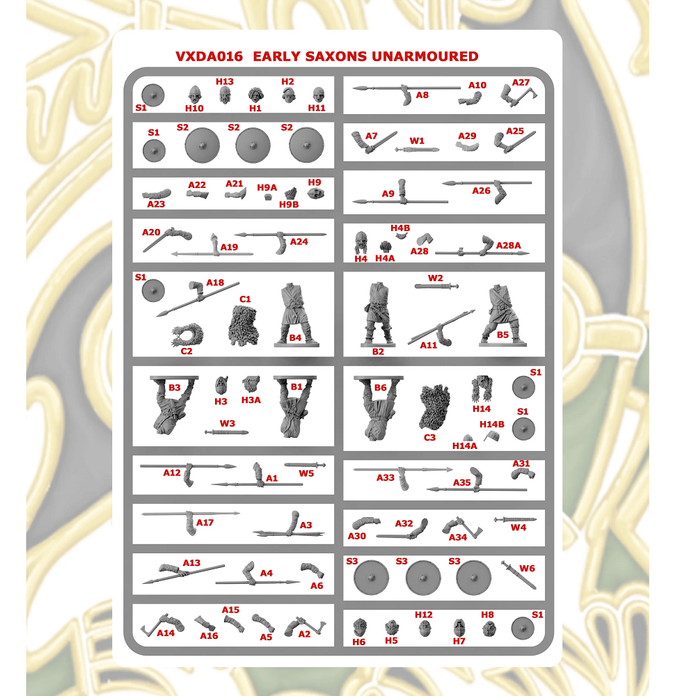 The Victrix Early Saxon Unarmoured Warriors set (VXDA016) contains 36 multi-pose 28mm hard plastic miniatures from the Victrix Dark Ages range. These figures represent the Saxons, Angles, Jutes, and Danes who invaded and settled in Britain during the 4th to 6th centuries, clashing with both the Late Romans and the Romano-British.
