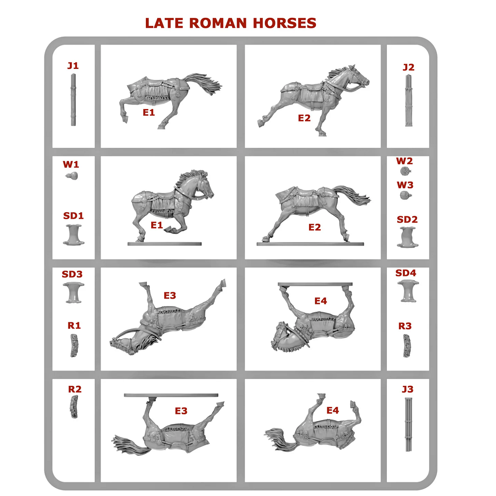 Two historically accurate shield sizes are provided: the large oval S1 and the smaller oval S2, reflecting the variety used by Late Roman cavalry. The set also features detailed horses complete with javelin cases, water bottles, and bedrolls for added realism.