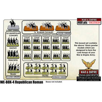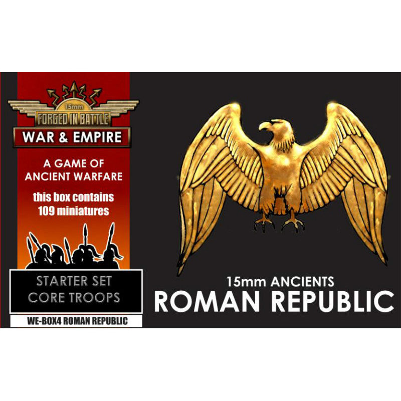 Command the efficient Roman Republic in epic 15mm scale conflict with Forged in Battle's War & Empire game system. This complete starter set consists of 102 miniatures, representing a 468 pt force that should form the core of your Roman army.