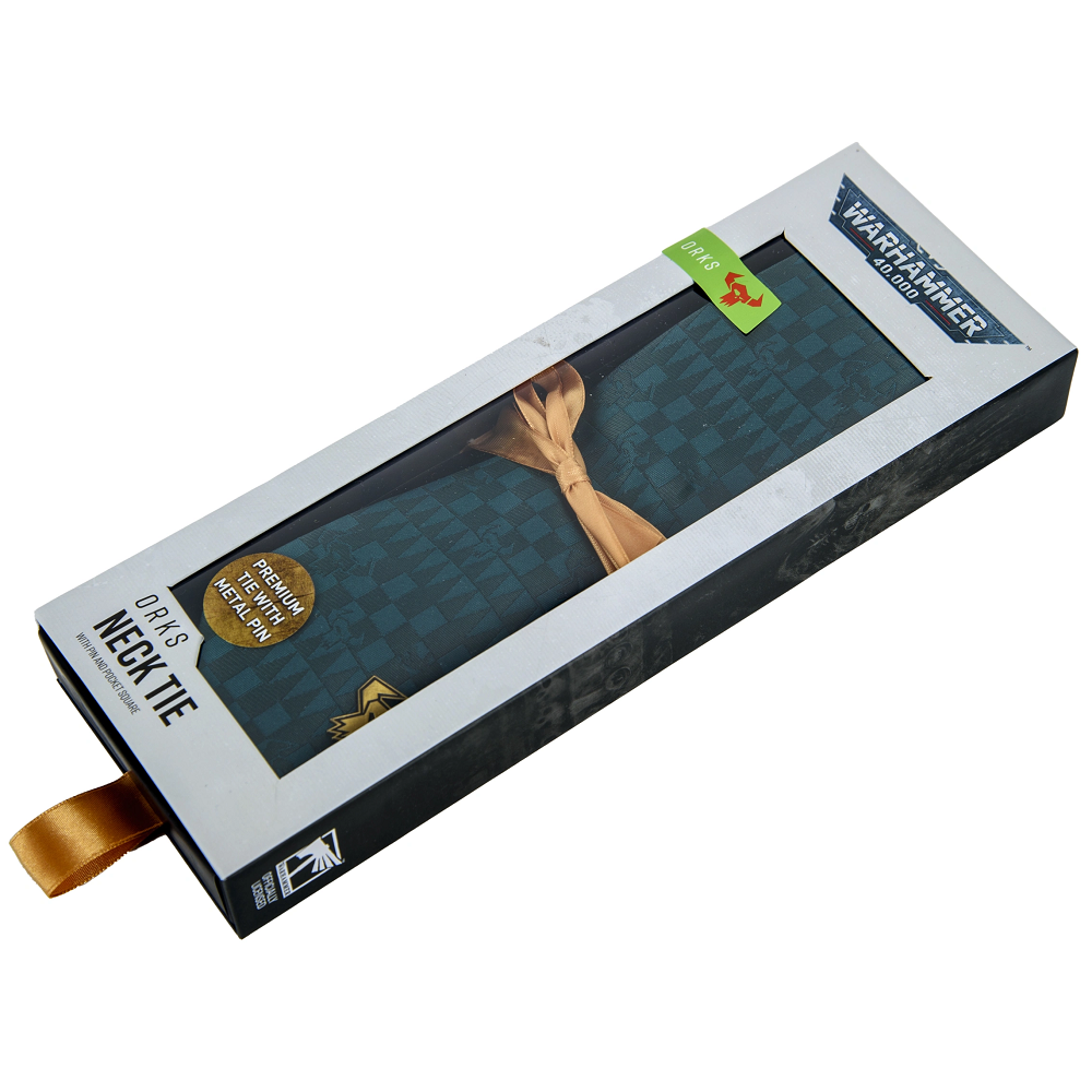 Warhammer 40k Orks Tie, add a little Waaagh to your day with this 100% polyester blend, green coloured tie with Ork symbol logo detailing, removable pin badge and pocket square.