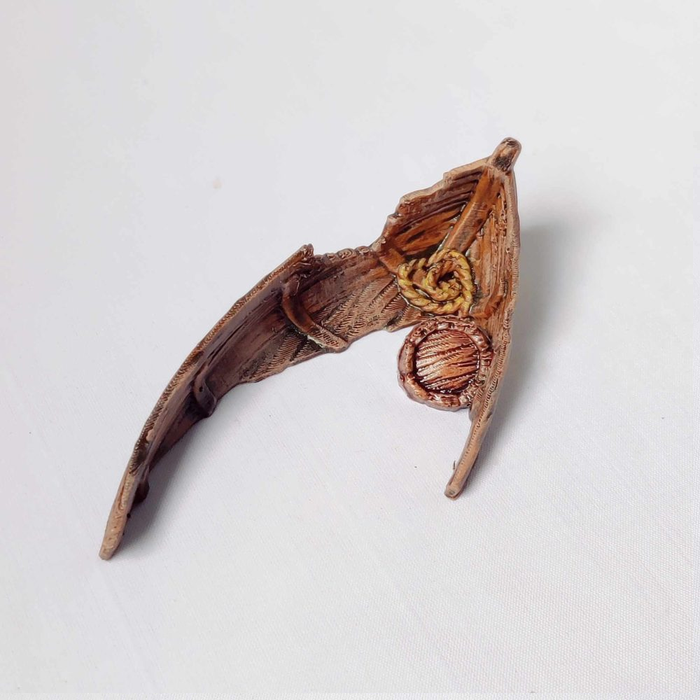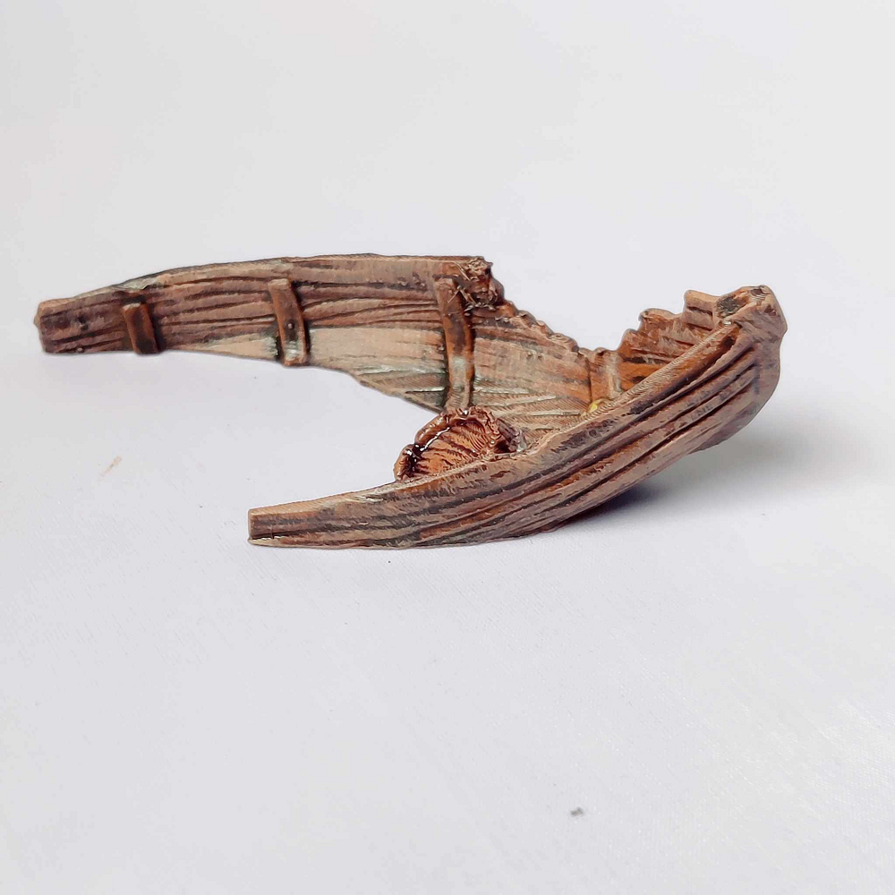 A wrecked rowboat from Iron Gate Scenery by Stone Axe Minis in 28mm scale printed in abs like resin and provided unpainted for your tabletop games and hobby needs.