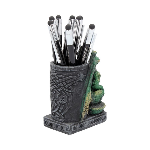 A decorative and useful wyrm pen pot, hand painted and practical for your home, office and gaming room. This lovely green wyrm dragon has a pot that you can use to store pens, brushes, dice and more making it a great gift for a hobbyist, DM/GM or a fantasy fan.