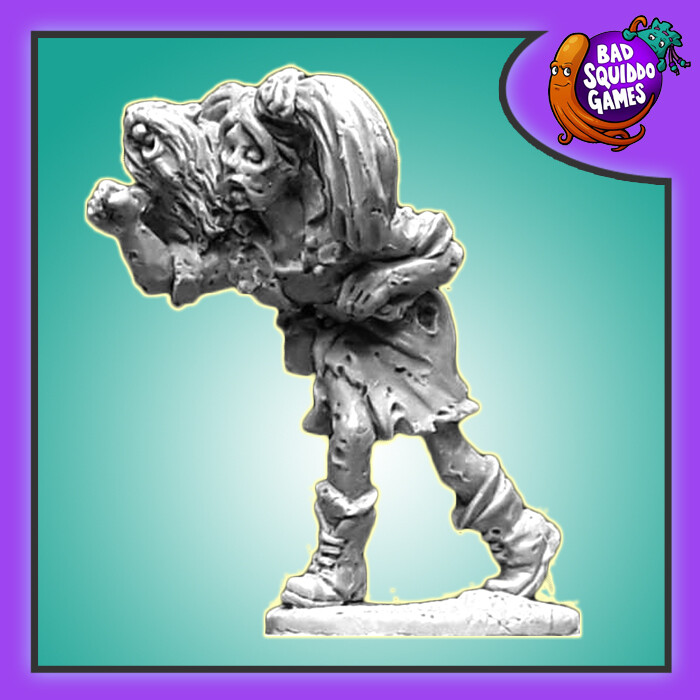 Bad Squiddo Games Zombie Annie With Zombie Peeg. A metal miniatures of zombie Annie with hair in pigtails and a zombie guinea pig on her shoulder